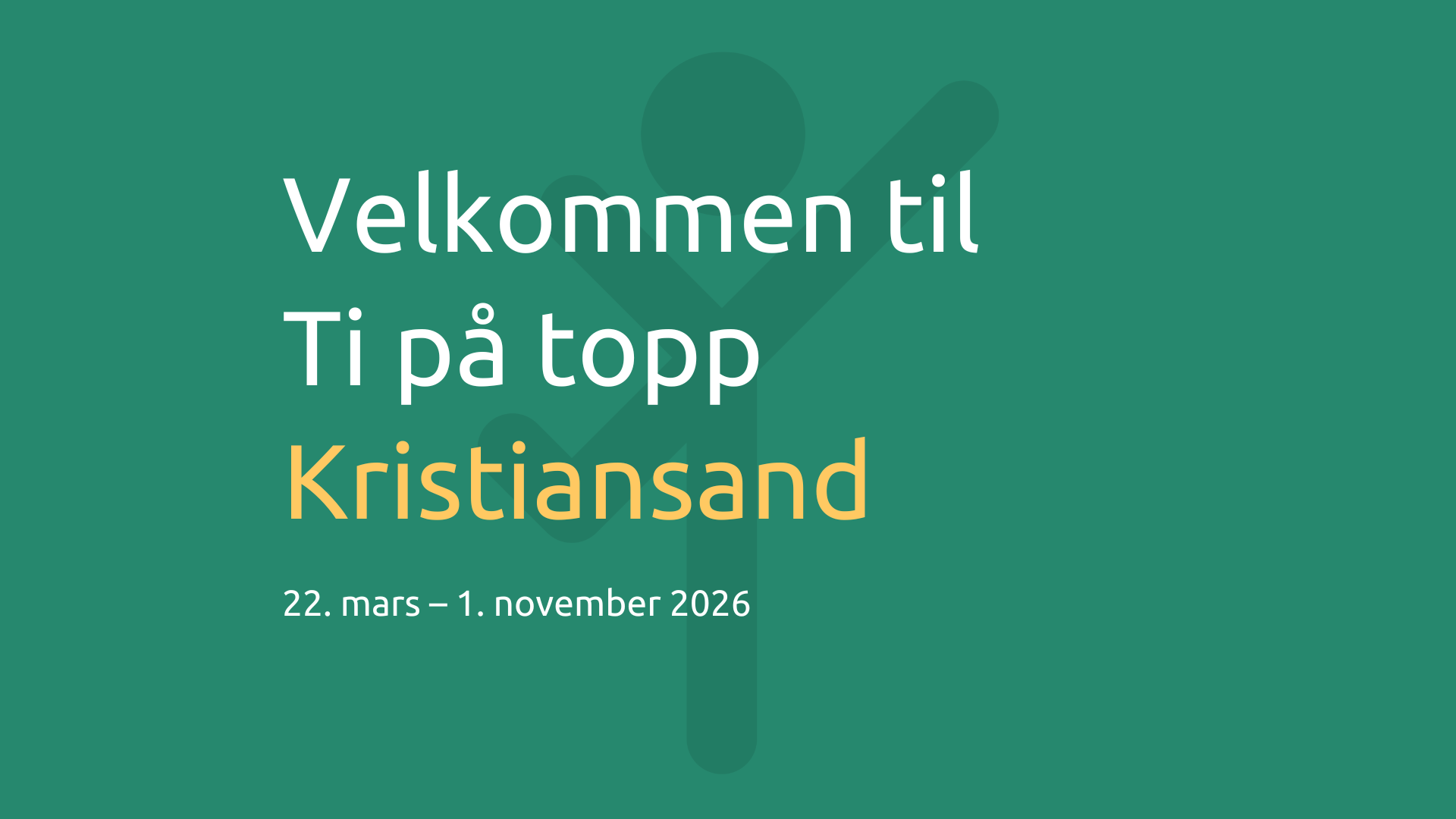 Som deltaker av Ti på topp får du tilgang til kart og turbeskrivelser til ulike turmål i Kristiansand. Registrer turene i appen. Du bestemmer selv hvor mange turer du vil gå og tempoet underveis.